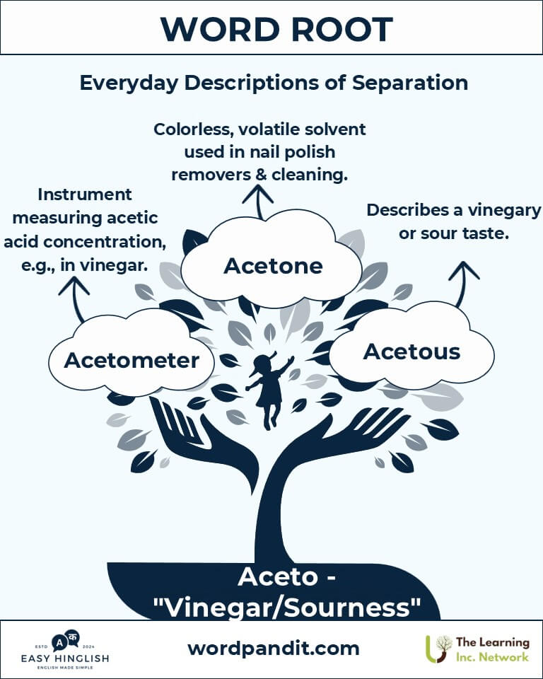 A: "Aceto" ka root Latin word acetum se aaya hai, jiska matlab hai "vinegar" ya "sour" (खट्टा). Yeh root commonly un cheezon ya processes ko refer karta hai jo acetic acid, sourness, aur fermentation se judi hoti hain.