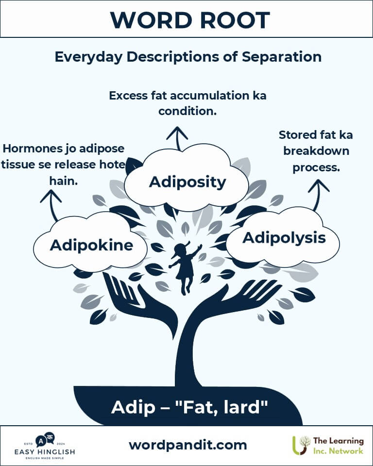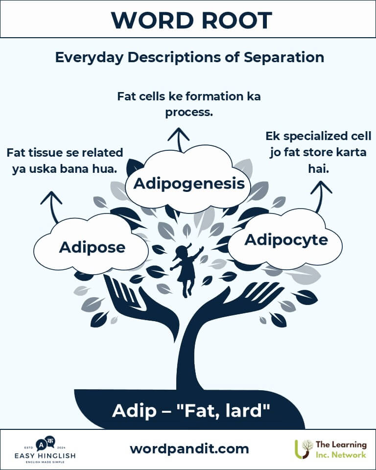(Fat शरीर में energy store करता है, organs को cushion करता है और temperature regulate करता है। Root "adip" इन सभी कामों को दर्शाता है।)
