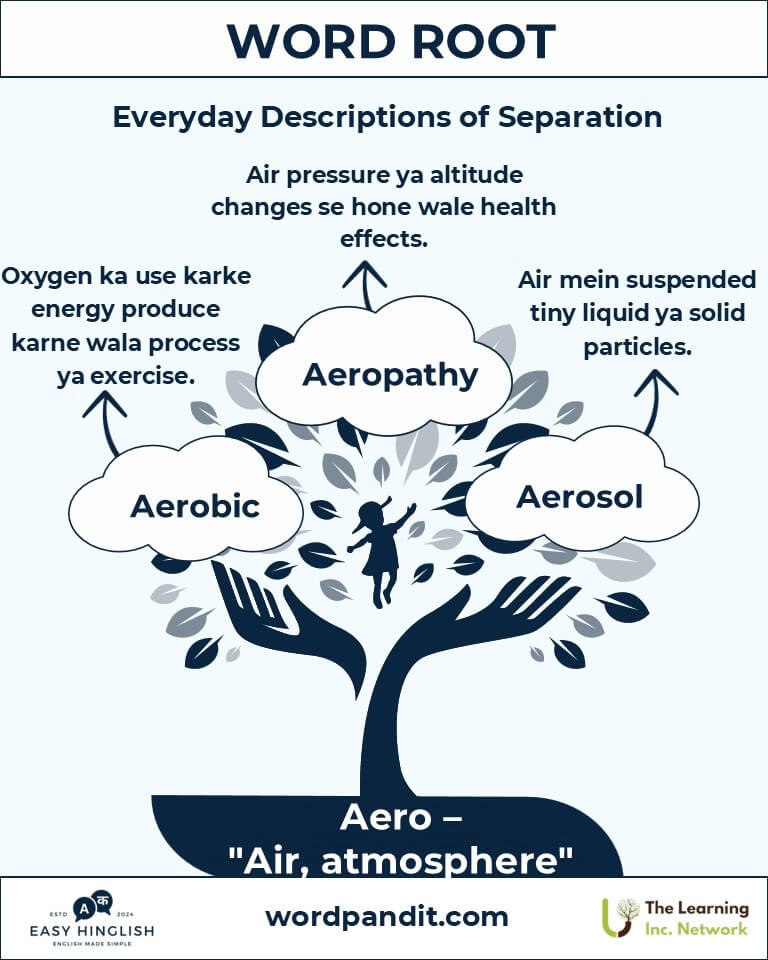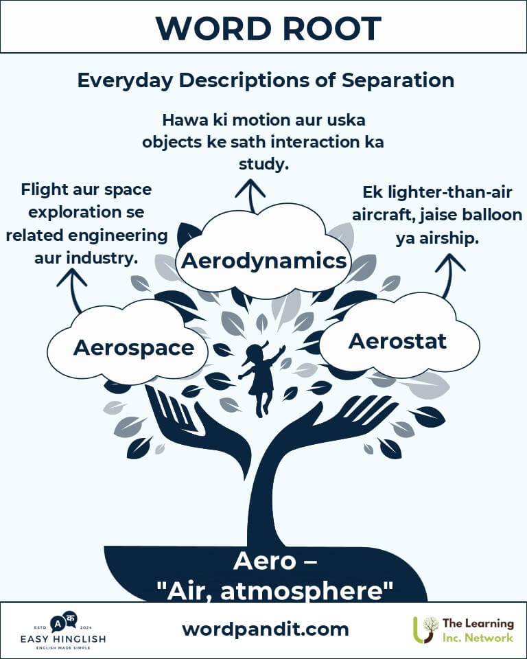 Sochiye hawa ka sparsh ya ek plane ko aasmaan mein udte dekhna – yeh sab Aero root ka example hai. Greek word "aēr" se derived, iska matlab hai "air" (हवा). Science, health, aur technology ke alag-alag domains mein iska influence bohot zyada hai.
