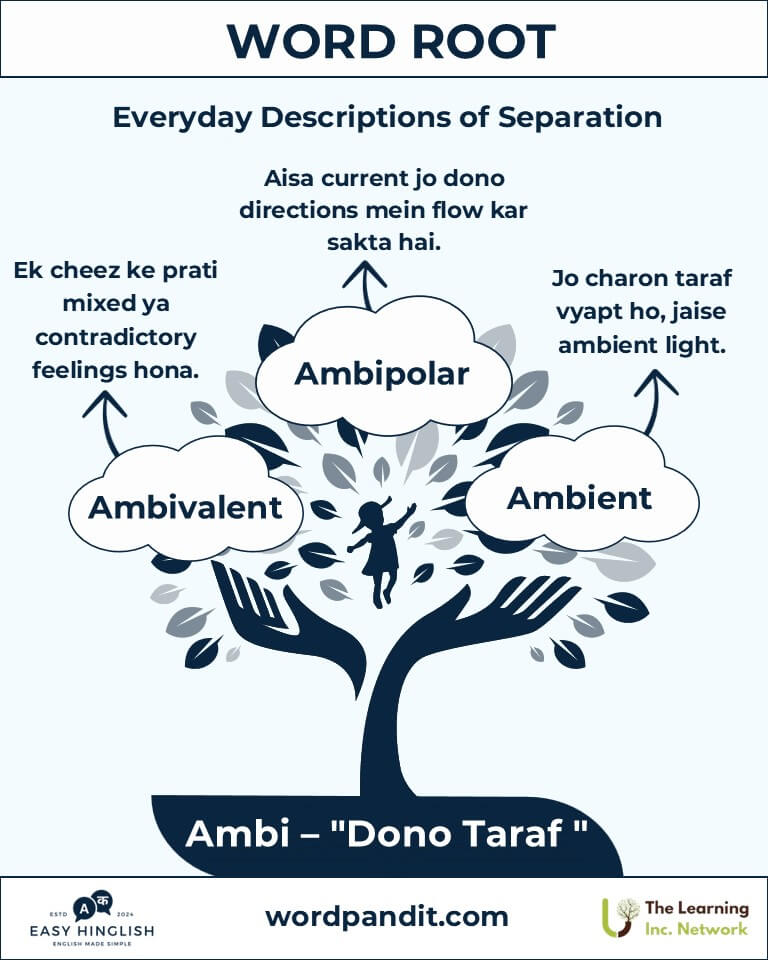 Discover the multifaceted nature of the word root "ambi," derived from Latin, meaning "both" (दोनों). From "ambidextrous" to "ambient," this root enriches our vocabulary by emphasizing duality, adaptability, and presence in various contexts.