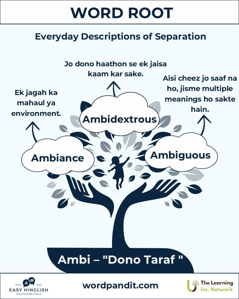 A: "Ambiguity" ambi (दोनों) aur agere (to drive - चलाना) se bana hai. Yeh uncertain situations ya multiple interpretations ko dikhata hai, jo "ambi" ki duality ka perfect example hai.