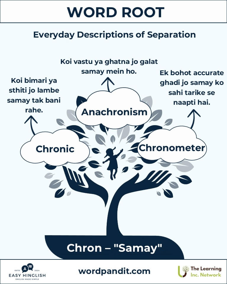 Kya common hai ek chronic illness, synchronized dance, aur timeline mein? Yeh sabhi "chron" root se jude hain, jo Greek shabd khronos (समय) se aaya hai. Iska uchcharan "kron" hai, aur yeh ek linguistic foundation provide karta hai un shabdon ke liye jo history, science, aur daily life mein use hote hain. Chahe baat ho perpetual conditions ki ya harmonious timing ki, "chron" humein yaad dilata hai ki samay (time) ka human experience par kitna gahra prabhav hai.