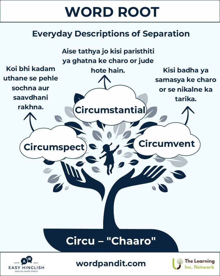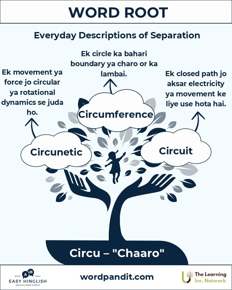 A: "Circu" ka matlab hai "around" (चारों ओर), jo Latin roots circus (circle) aur circum (around) se aaya hai. Yeh motion, boundaries, aur encompassing ideas ko dikhata hai.