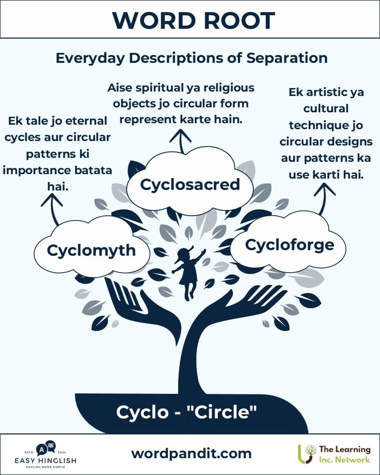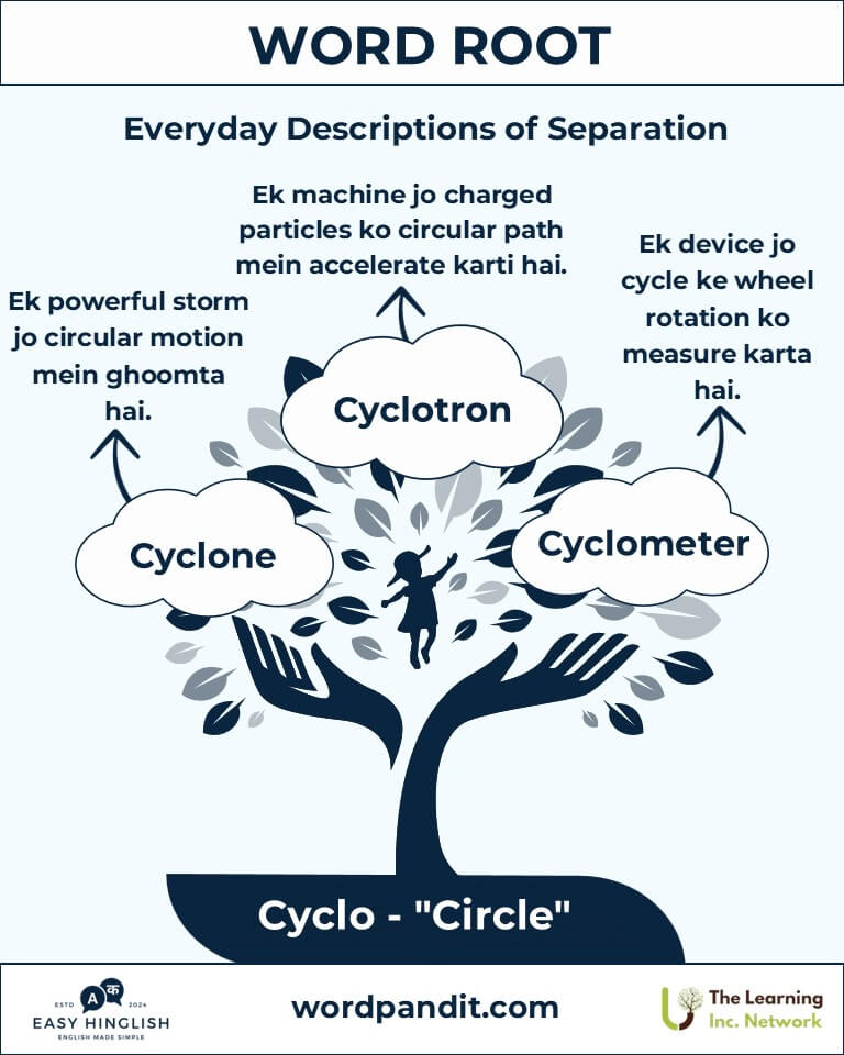 Discover the fascinating journey of the root "Cyclo", originating from the Greek word for "circle" or "wheel" (गोल चक्र या पहिया). From powerful cyclones (चक्रवात) to cutting-edge cyclotrons (चक्रित्र), yeh versatile root shapes vocabulary in natural phenomena, technology, aur geometry.