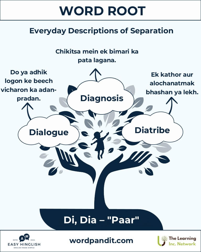 A: "Di" aur "Dia" ka matlab hai "through" (माध्यम से) ya "across" (पार). Yeh Greek root διά (dia) se aaya hai aur passage (मार्ग) aur connection (संबंध) ka concept dikhata hai.