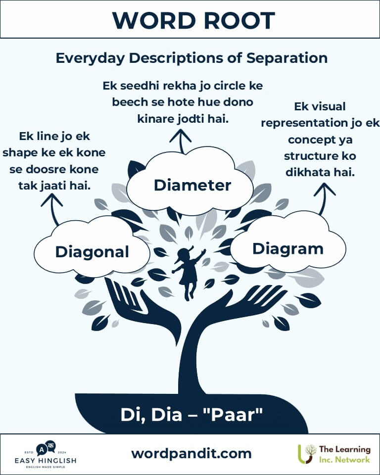 "Diagonal" aur "Diameter" jaise shabdon ka connection kya hai? Yeh sab Greek roots "di" aur "dia" se aate hain, jinka arth hai "through" ya "across" (के पार या माध्यम से)।