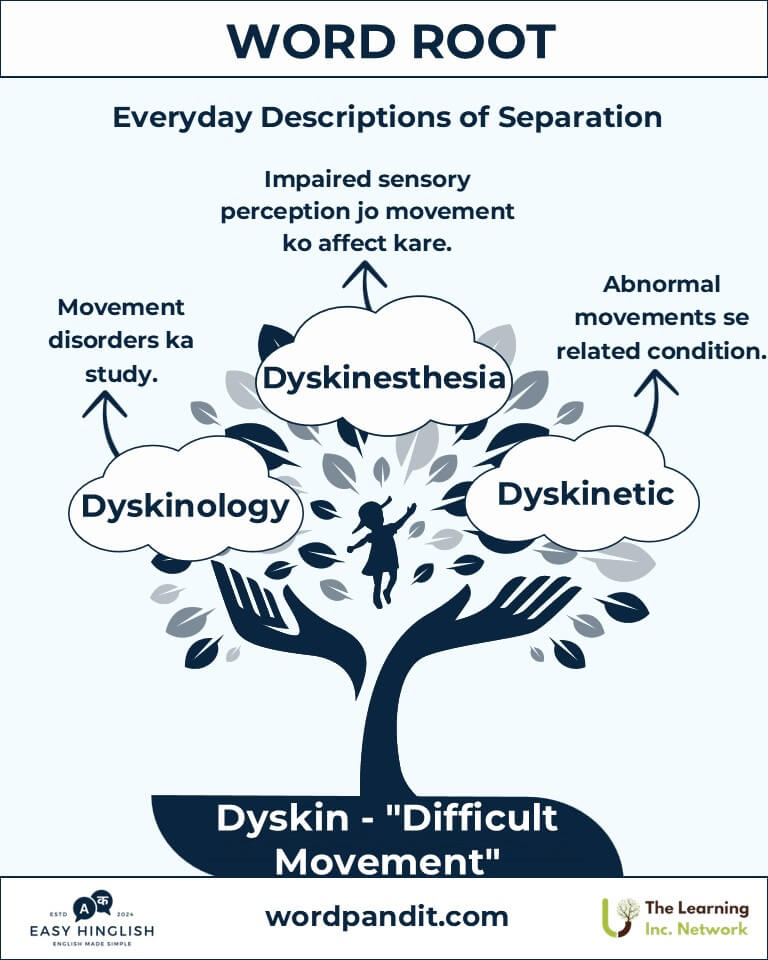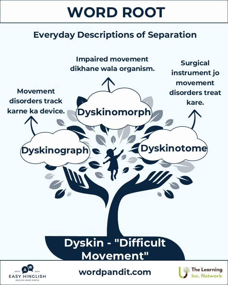The root "dyskin," pronounced "DIS-kin," combines the Greek prefix "dys-" (bad, difficult - बुरा, कठिन) and "kinesis" (movement - गति). It symbolizes impaired or challenging motion. Found in medical and philosophical lexicons, "dyskin" helps us understand motor function complexities and disruptions.