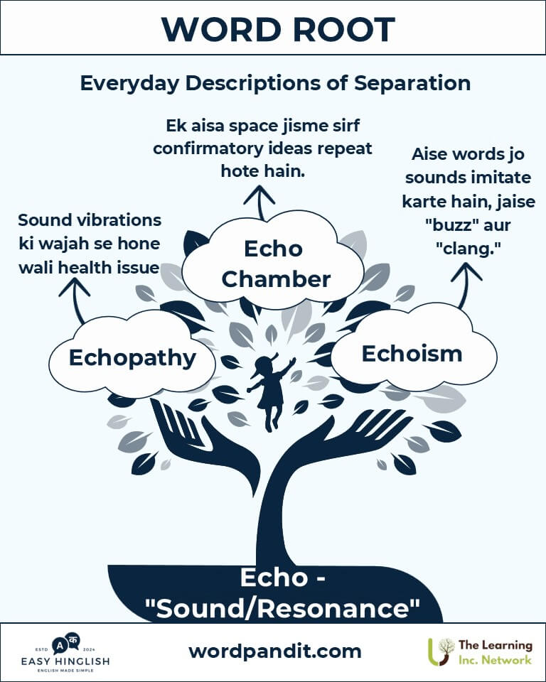 Example: "Social media echo chambers banakar beliefs reinforce karta hai." - Echoism (EH-koh-iz-um): Words create karna jo sounds imitate karte hain.