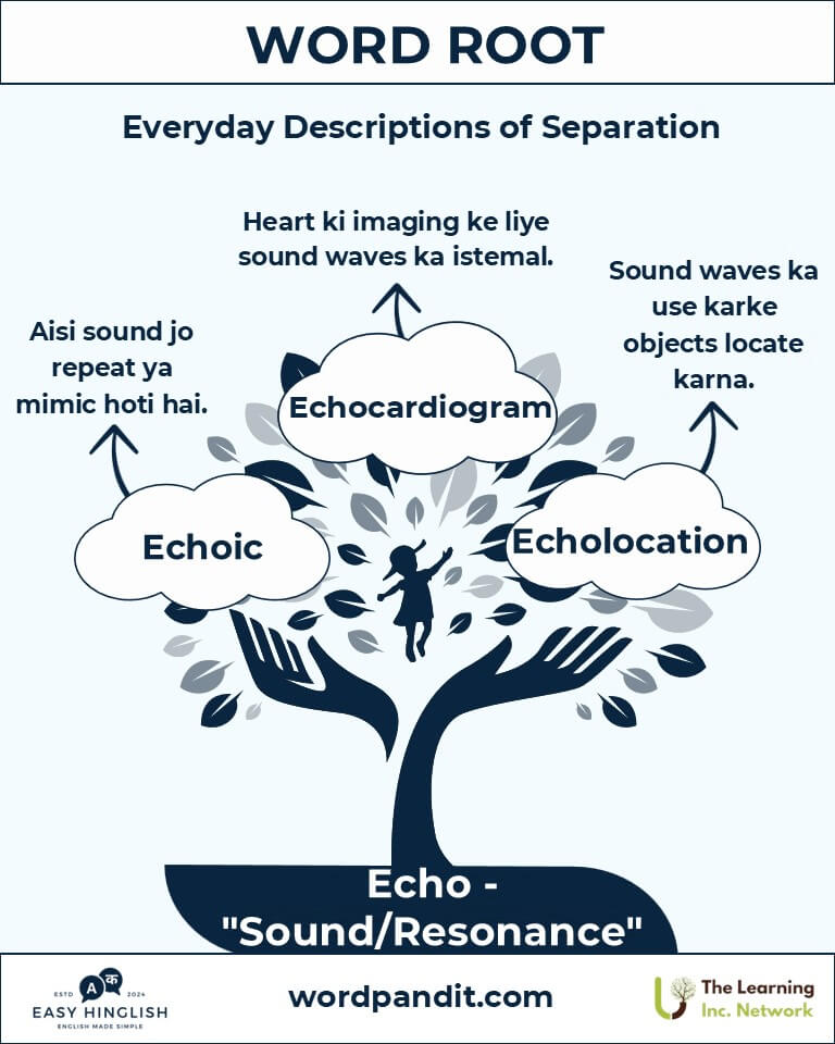 Discover the fascinating journey of the root "echo," originating from the Greek word ēchō meaning "sound" (ध्वनि). Iska use scientific applications, literature, aur modern metaphorical usage tak hota hai. "Echo" root ke words humein sound ki significance aur resonance ke concepts ke baare mein sikhate hain.
