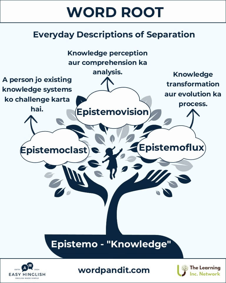 Discover the profound depth of the word root "Epistemo," derived from the Greek word episteme, meaning "knowledge" (ज्ञान)। Yeh root philosophy, science, aur linguistics mein bahut impactful hai, jaise epistemology aur epistemic concepts mein।