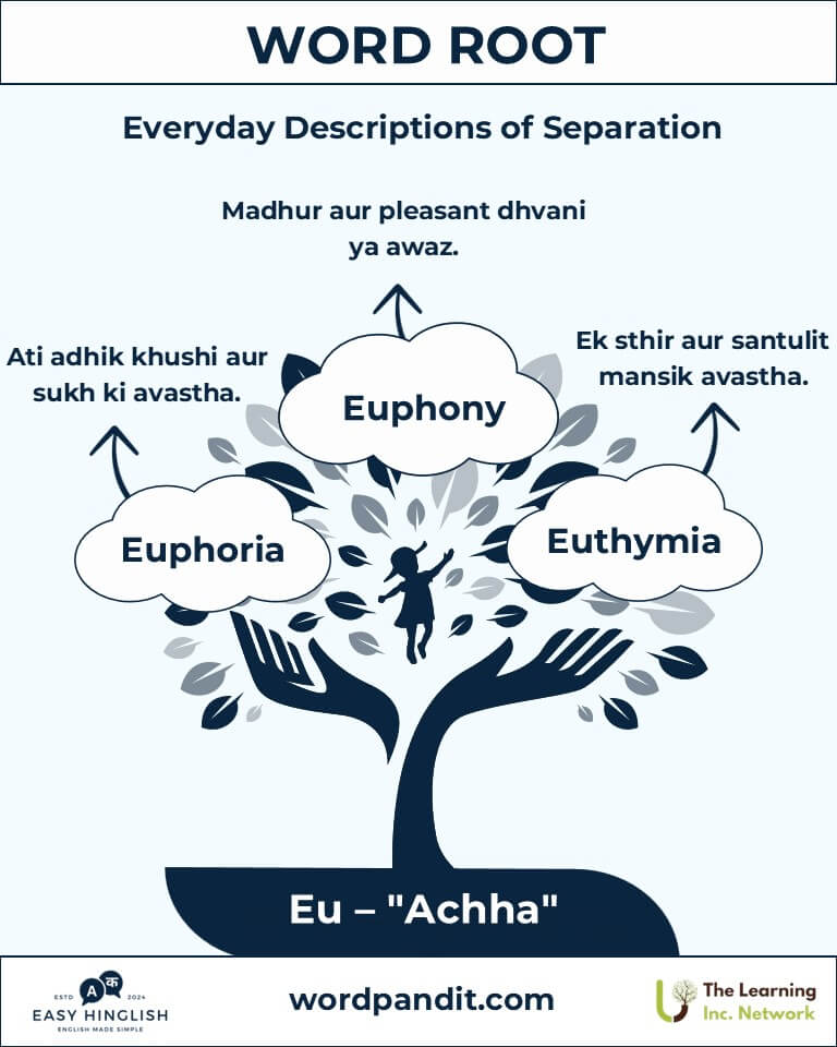 A: "Eu" ka matlab hai "good" (अच्छा) ya "well" (ठीक), aur yeh Greek language se aaya hai. Yeh root positivity (सकारात्मकता), wellness (स्वस्थता), aur excellence (उत्कृष्टता) ko dikhata hai. Examples hain euphoria (बेहद खुशी) aur eulogy (प्रशंसा वाला भाषण).
