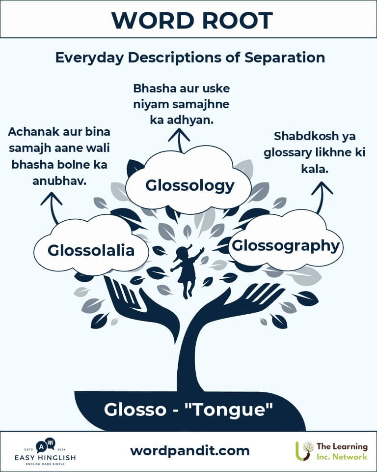 Discover the charm of the root "Glosso," derived from the Greek word meaning "tongue" (जुबान). From terms like "glossitis" (जीभ की सूजन) to "glossary" (शब्दों और अर्थों का संग्रह), yeh root humein language (भाषा), expression (अभिव्यक्ति), aur medical terminology (चिकित्सा शब्दावली) ke concepts samjhata hai.