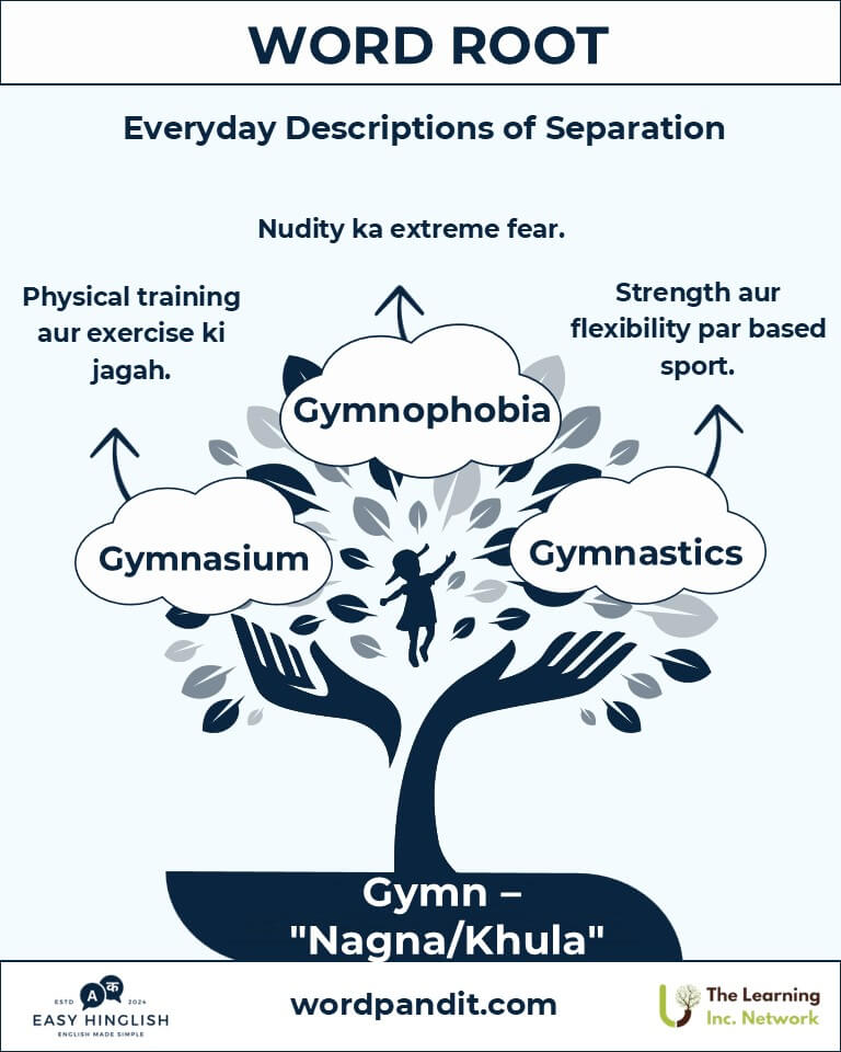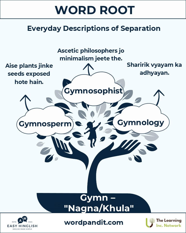 The root "gymn," pronounced "jim-n," comes from the Greek word "gymnos," meaning "naked" (नग्न). It represents exposure (खुलापन) and foundation (आधार), whether in physical training or natural growth.