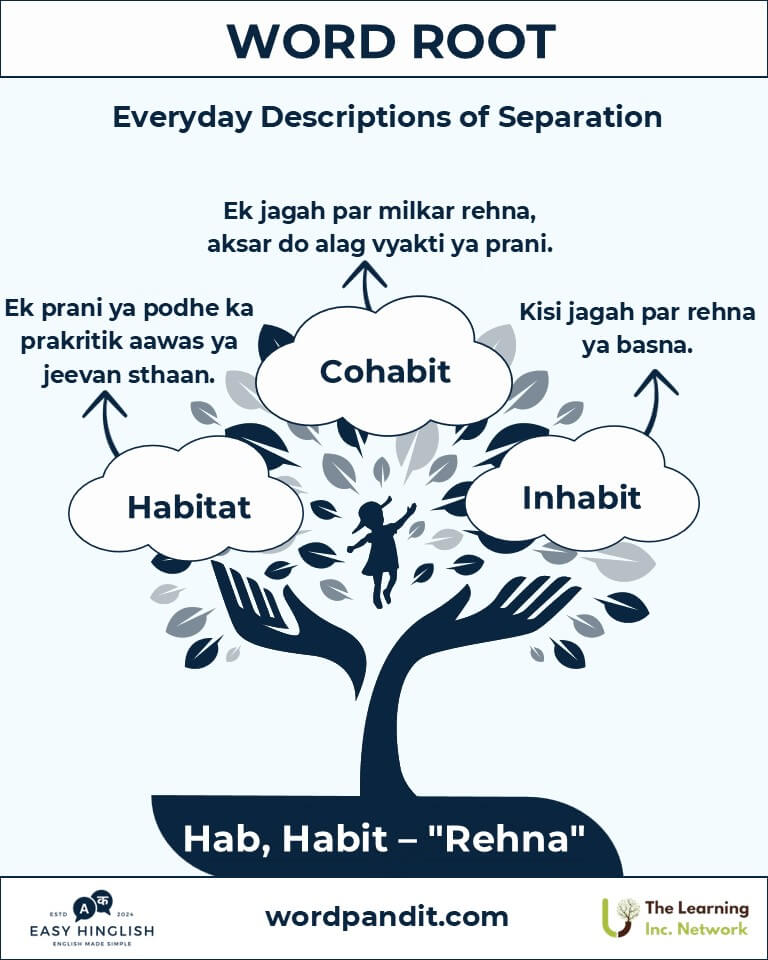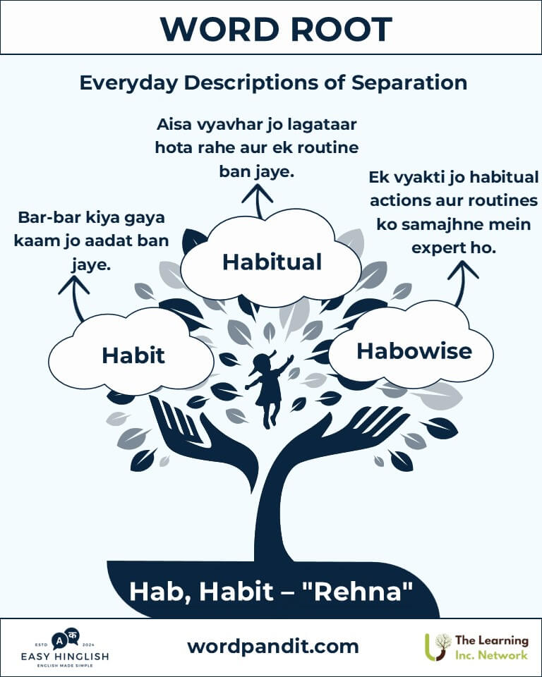 Discover the fascinating roots hab and habit, derived from Latin, meaning "to dwell" (रहना) or "to hold" (पकड़ना). From everyday terms like "habitat" (प्राकृतिक आवास) to the philosophical depths of "habitual" (आदतन), these roots reveal the essence of residence and repetition in our language and lives.