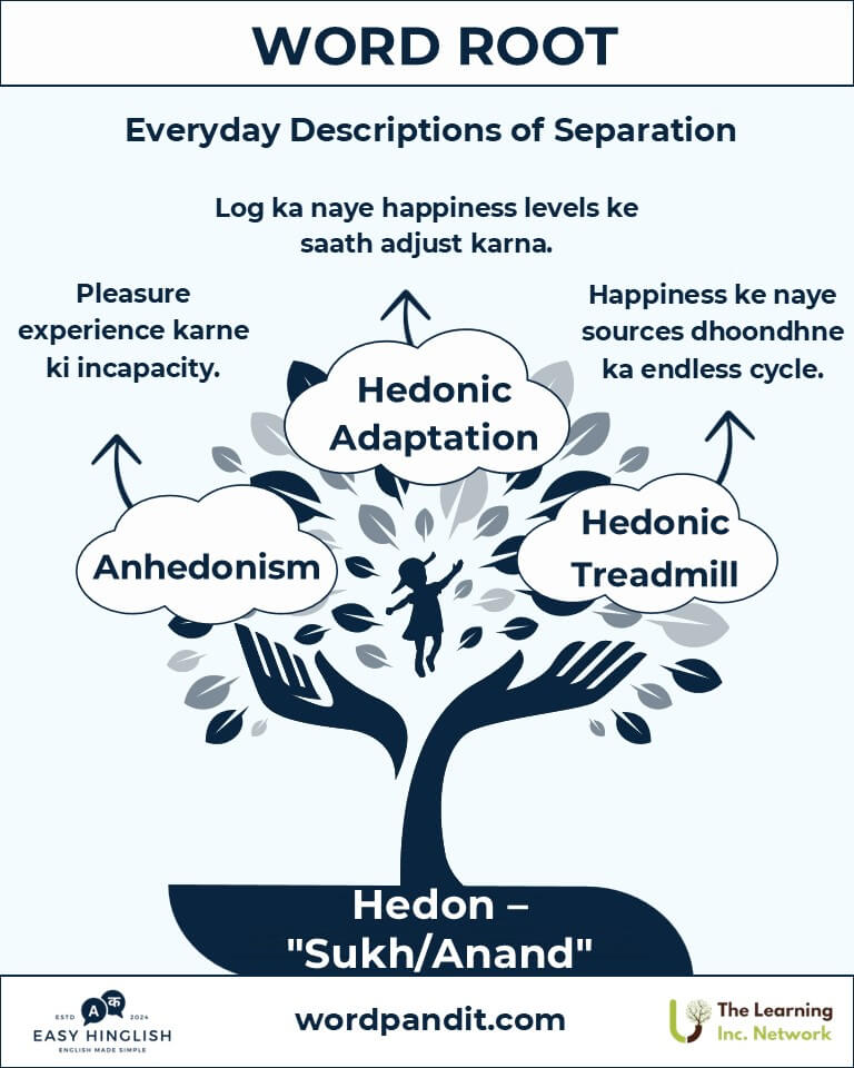 "Hedon" (**hee-don**) ka matlab hai **pleasure ya sukh (आनंद)**, jo Greek word **"hēdonē"** se aaya hai. Is root se banne wale words humein **human desires aur happiness** ke bare mein samajhne ka ek nazariya dete hain. Ek **hedonist** apni life ke pleasures ko enjoy karta hai, jabki **"anhedonism"** joy ki kami ko dikhata hai. Is root ki study **satisfaction aur well-being** ke concept ko deeply explore karti hai.