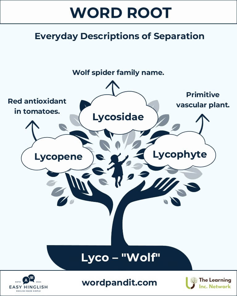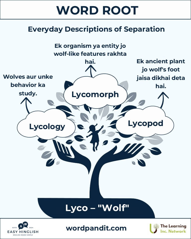 "Lyco" root humein jungle aur mythical wolves (काल्पनिक भेड़िये) ke imagery ka yaad dilata hai. Greek shabd lykos se derived, iska arth hai "wolf" (भेड़िया). Yeh root un shabdon mein dikhayi deta hai jaise "lycanthropy" (werewolf myths) aur "lycopene" (tomatoes mein ek antioxidant). Lyco ek fascinating bridge banata hai jo ancient myths aur modern science ko jodta hai.