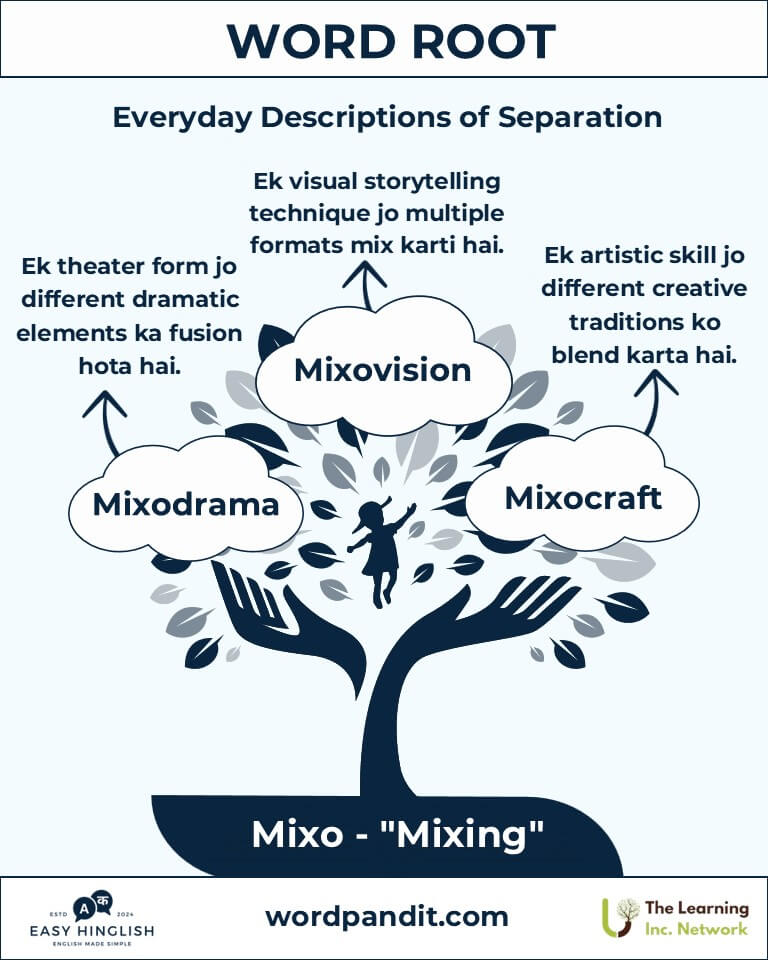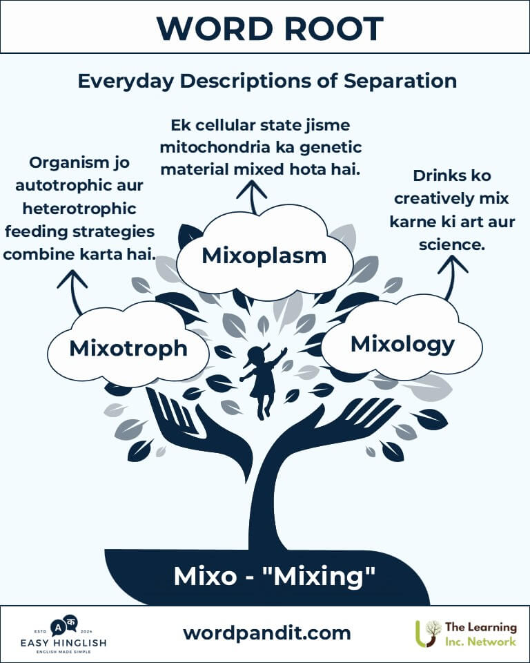 Discover the versatile root "Mixo," originating from the Greek word mixis, meaning "mixing" (मिश्रण). Yeh root humein combination aur integration ka concept samjhata hai across biology, linguistics, aur medicine. Words jaise mixotroph aur mixedema humein dikhate hain kaise "mixing" humare life aur health ko influence karta hai.