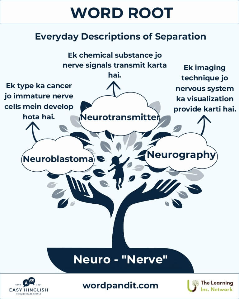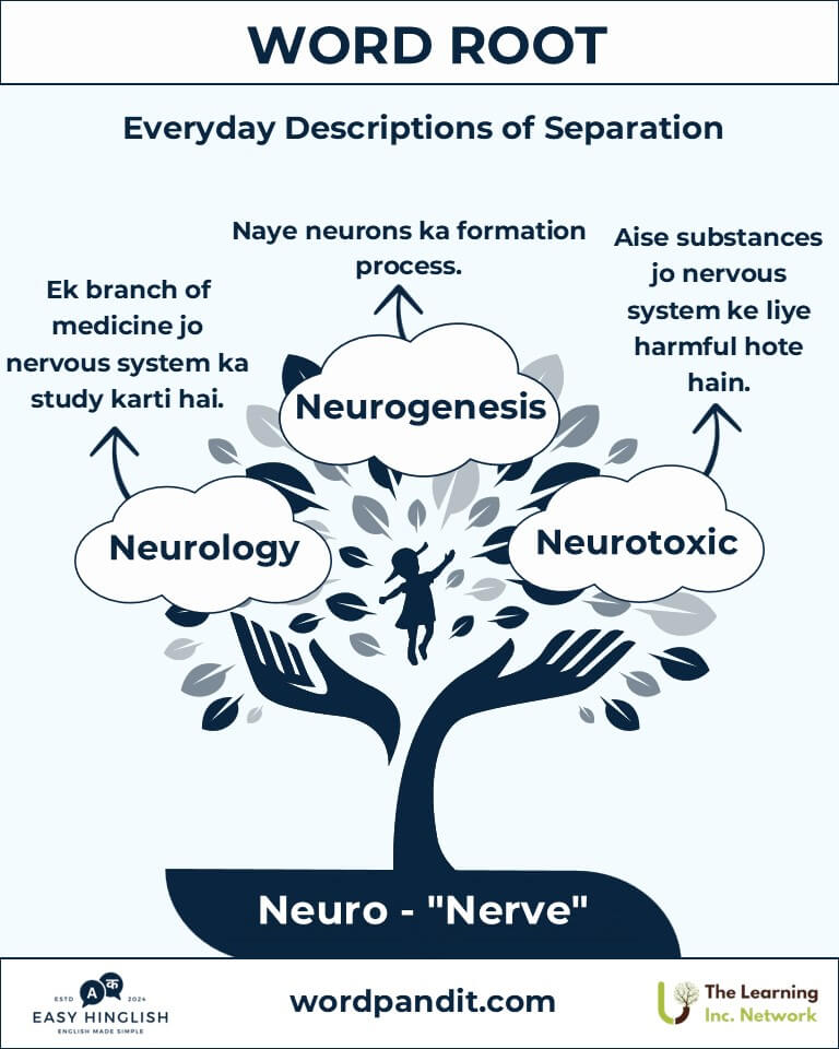 Discover the profound significance of the root "Neuro", derived from the Greek word neuron (न्यूरॉन) meaning "nerve" (तंत्रिका). Words like "neuron", "neurology", aur "neuroscience" nervous system ke complexities aur innovations ka darshan karte hain.