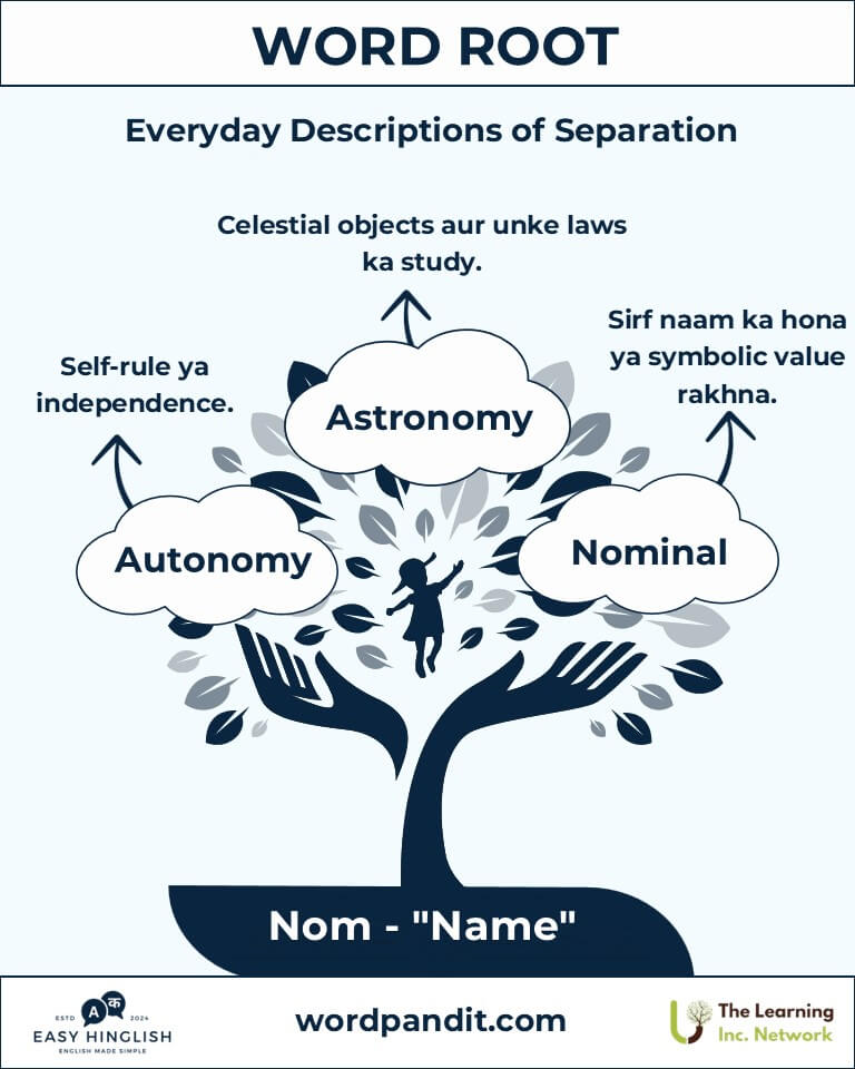 "Nom" root ka matlab hai naam aur niyam—do concepts jo duniya ko samajhne aur organize karne mein help karte hain. Latin "nomen" aur Greek "nomos" se derived, "Nom" ka use language aur science mein hota hai, jaise naming systems (nominate) aur cosmos ke laws (astronomy).