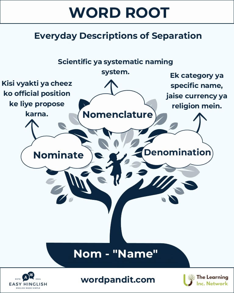 Discover the fascinating world of "Nom," ek root jo Latin aur Greek origins se aya hai aur iska matlab hai "name" (नाम) ya "law" (कानून). Yeh root humein batata hai ki kaise naam aur niyam (rules) ka mahatva language aur science mein hai.