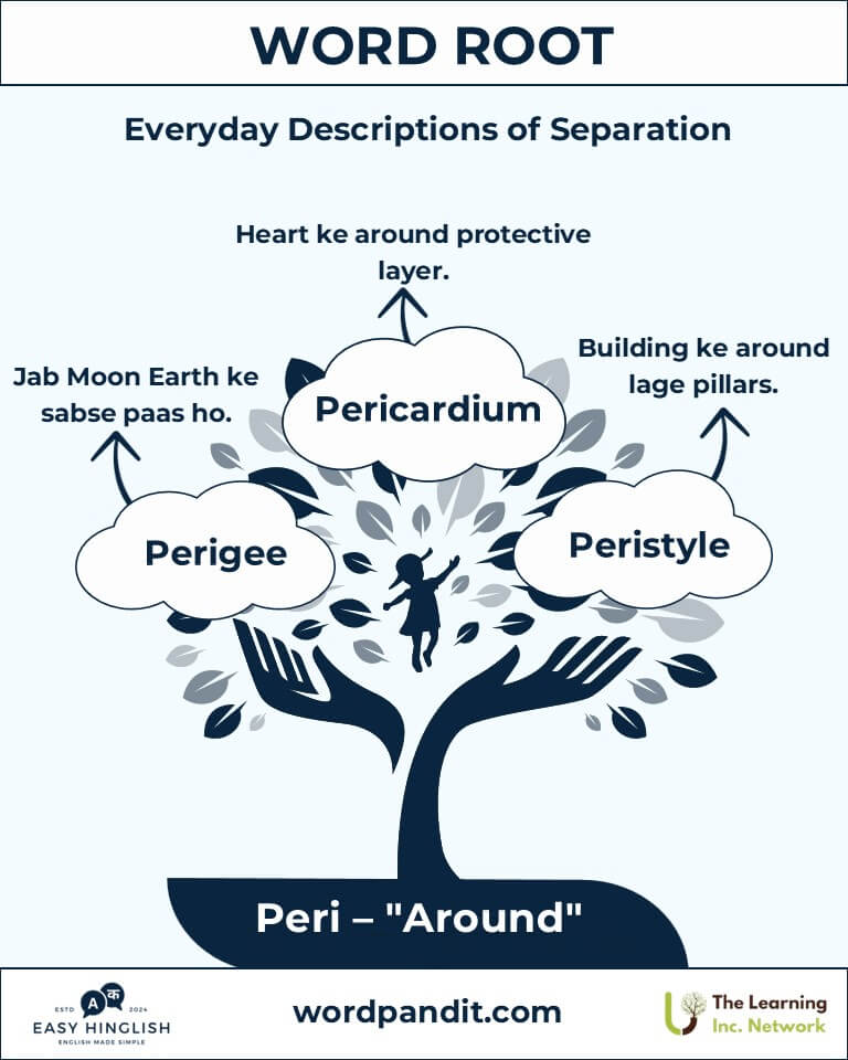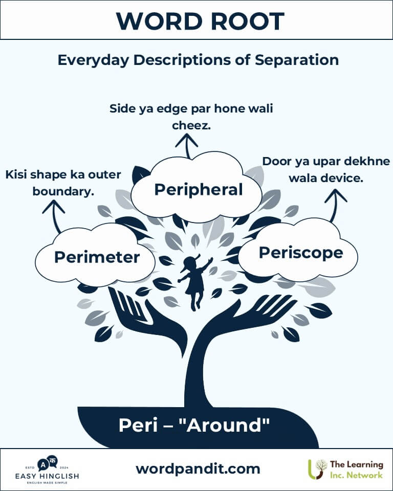 Discover the significance of the root "peri", derived from Greek, meaning "around" (आसपास). Yeh root words jaise "perimeter" aur "peripheral" mein use hota hai, jo boundaries (सीमाएं), surroundings (आसपास), aur lateral vision ko define karta hai.
