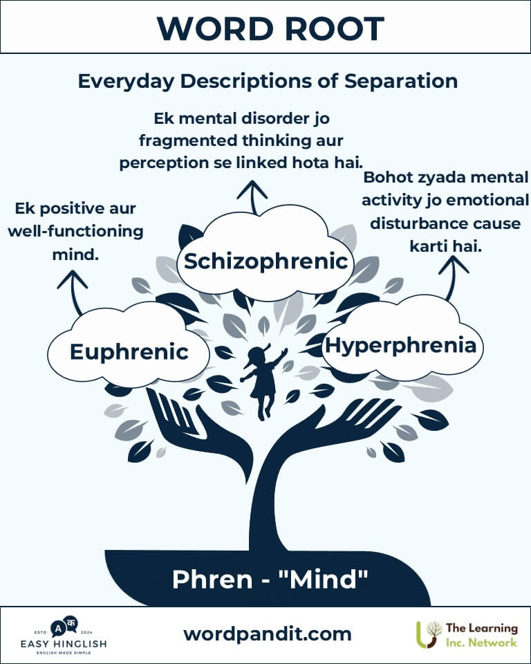 Kabhi socha hai ki humare thoughts aur emotions kaise connected hote hain? "Phren" Greek root word phrēn se aaya hai, jiska matlab hai "mind" (मन) ya "diaphragm" (डायफ्राम). Ancient Greeks ko lagta tha ki diaphragm emotions aur intellect ka ghar hota hai. Aaj ke time mein, "Phren" mental health aur emotional depth ko describe karne ke liye commonly use hota hai.