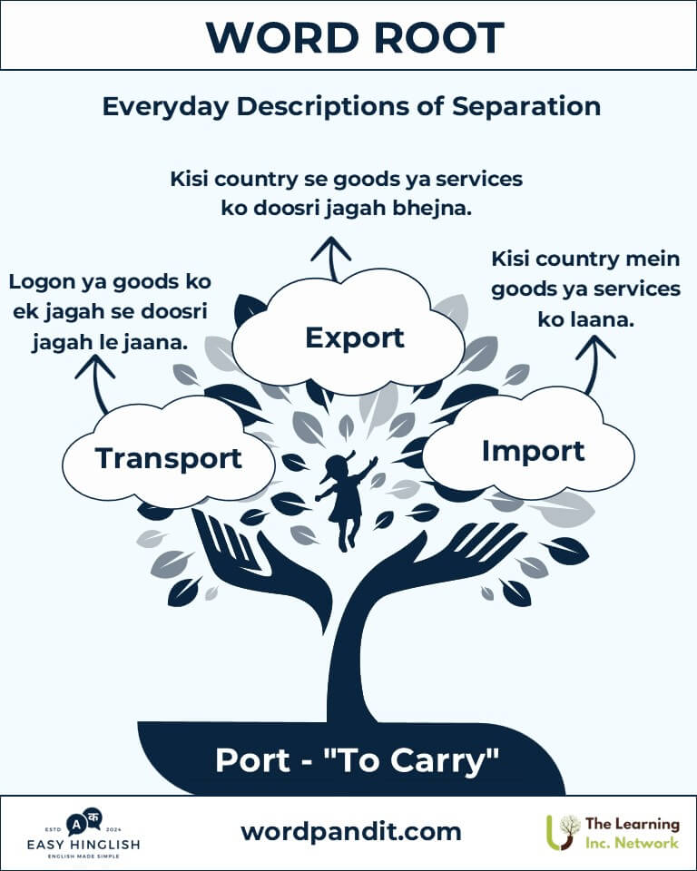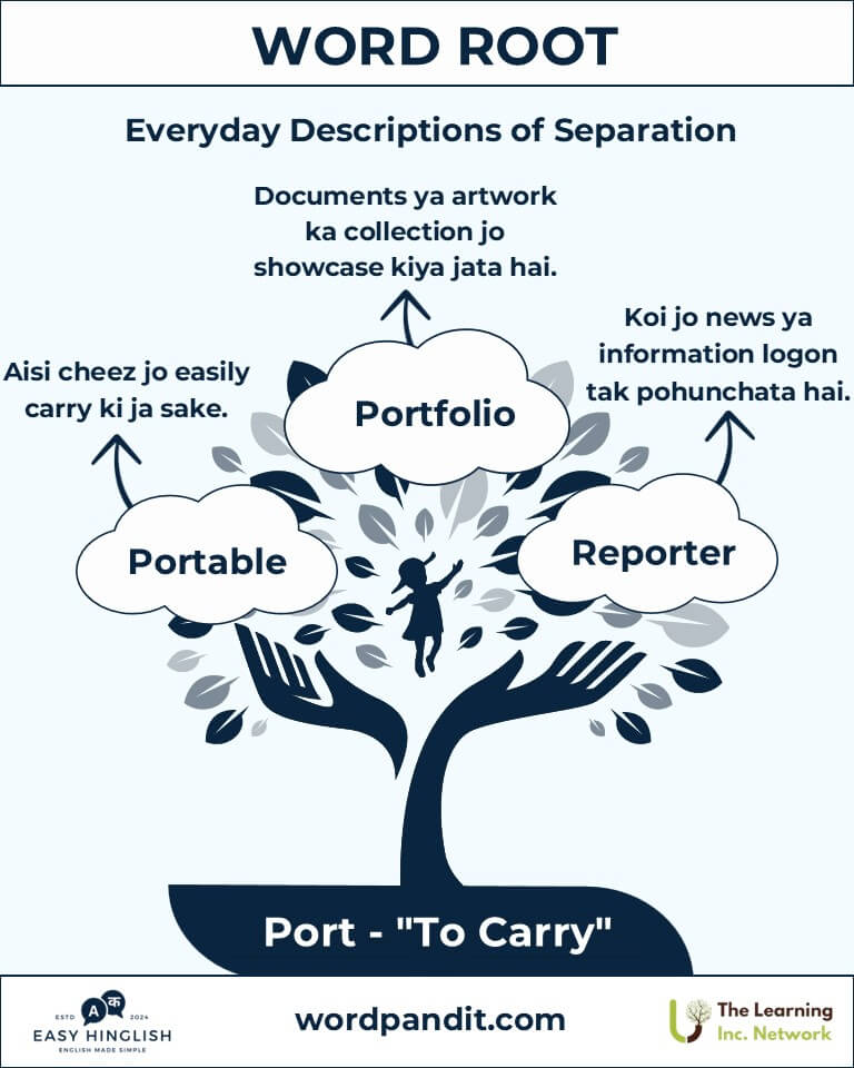 Discover the profound utility of the root "Port," originating from Latin, meaning "to carry" (ले जाना). Words like "transport" (ट्रांसपोर्ट) aur "portable" (पोर्टेबल) humein is root ke widespread use ke baare mein batate hain jo day-to-day aur specialized fields mein istamaal hota hai.
