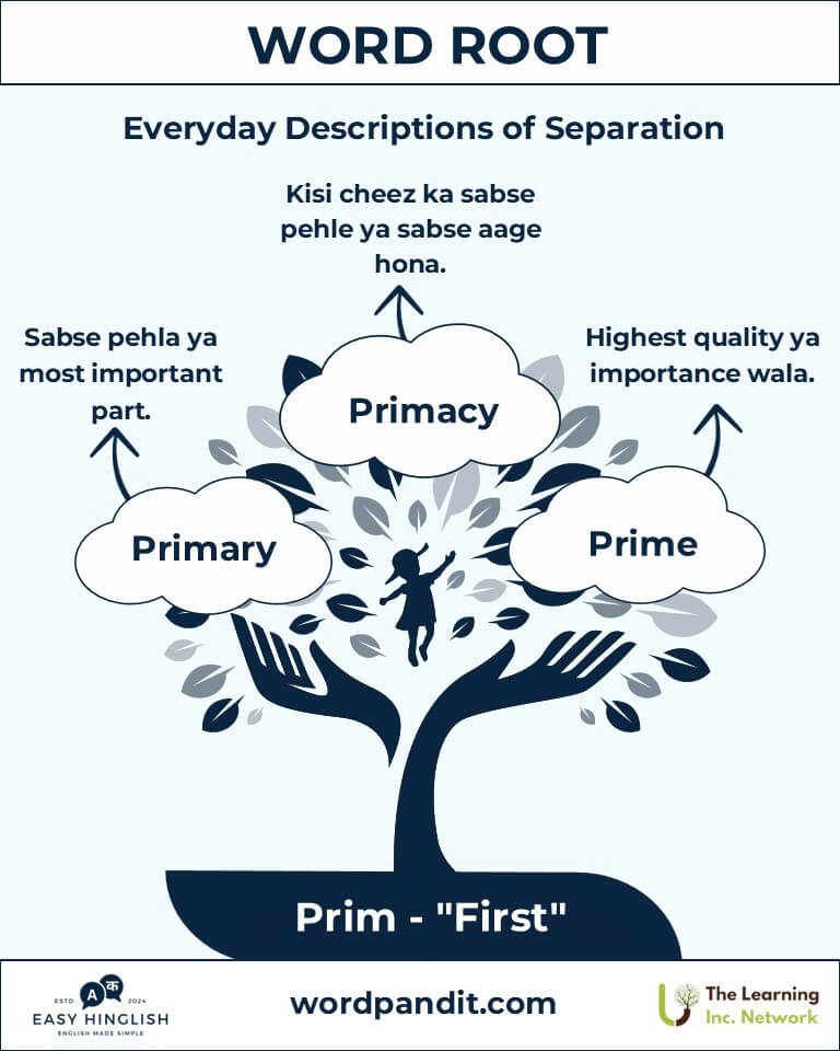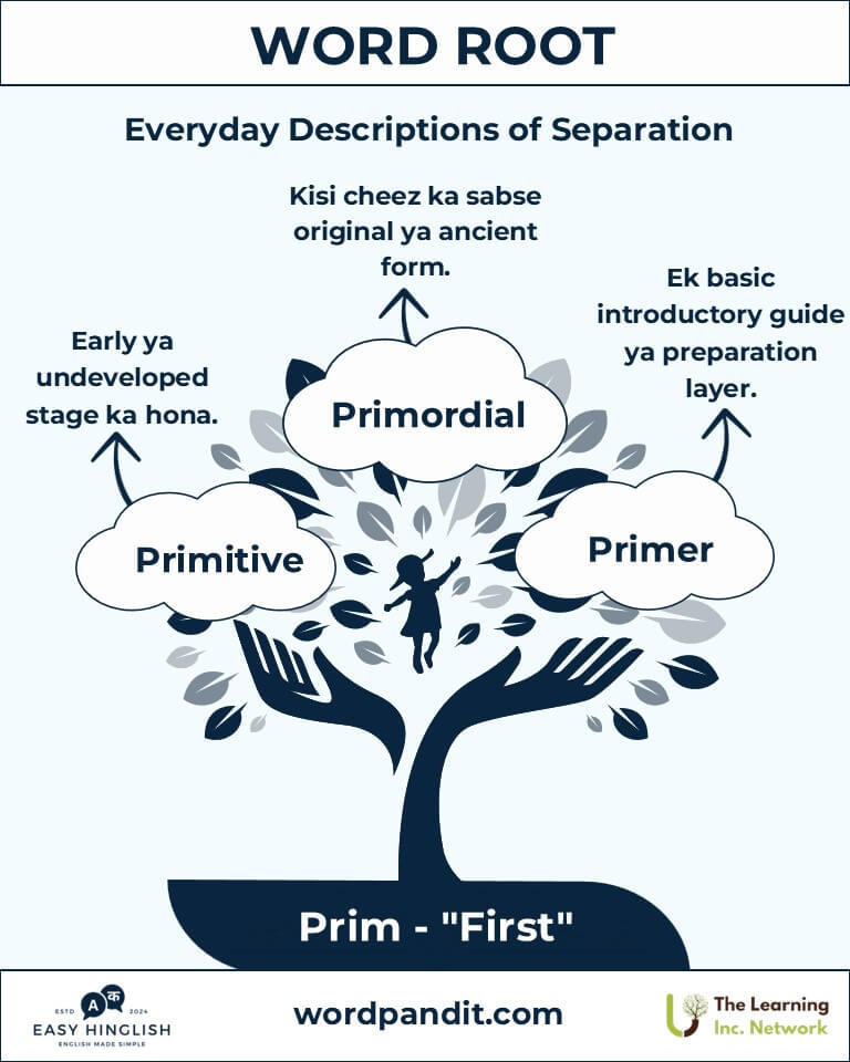 Aapki zindagi ka pehla kadam ya pehli chamakti taara—sab kuch "prim" se shuru hota hai. Yeh root Latin shabd primus se aaya hai, jiska matlab hai "first" (पहला). Iska asar order (क्रम), importance (महत्व), aur origin (उत्पत्ति) ke concepts par hota hai. "Primary education" (प्राथमिक शिक्षा) se lekar "primitive tools" (आदिम औज़ार) tak, prim humein shuruaat aur mulbhut cheezon ke baare mein batata hai.