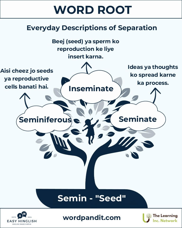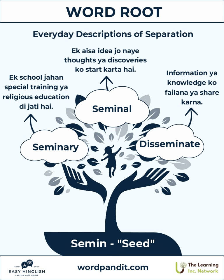 Words jaise seminary aur seminal ka common kya hai? Dono Latin root "semin" se derive hote hain, jiska matlab hai "seed" (बीज). Jaise seeds nature mein beginnings aur potential ko represent karte hain, waise hi yeh root growth aur ideas ke spread ka essence capture karta hai. Education, agriculture, aur innovation mein, "semin" ek narrative weave karta hai jo origins aur transformation ke power ko dikhata hai.
