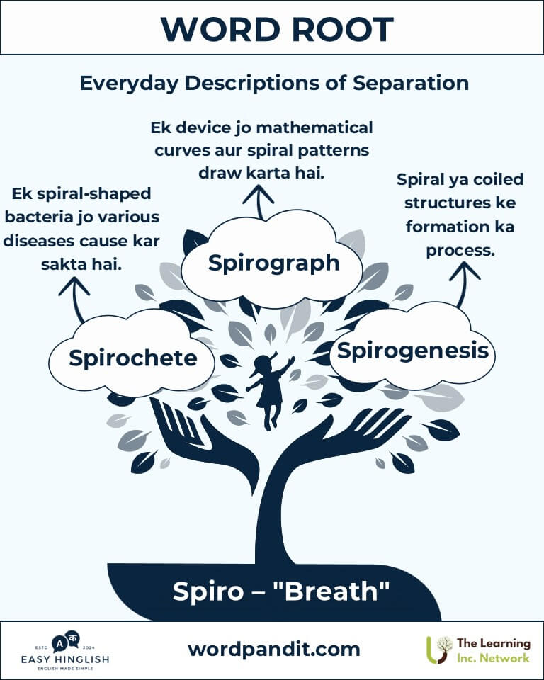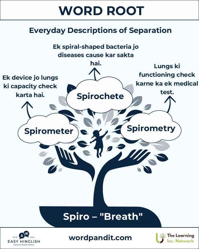 A: "Spiro" ka matlab hai "breath" (सांस), aur yeh Latin word spirare (to breathe) se aaya hai. Yeh root air, respiration, aur life force se related words ka foundation hai.