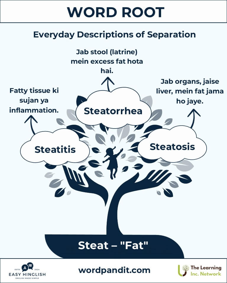 A: "Steat" ka matlab hai "fat" (वसा), aur yeh Greek word "steatos" se aaya hai. Yeh root health aur science mein fat-related conditions ko describe karta hai.