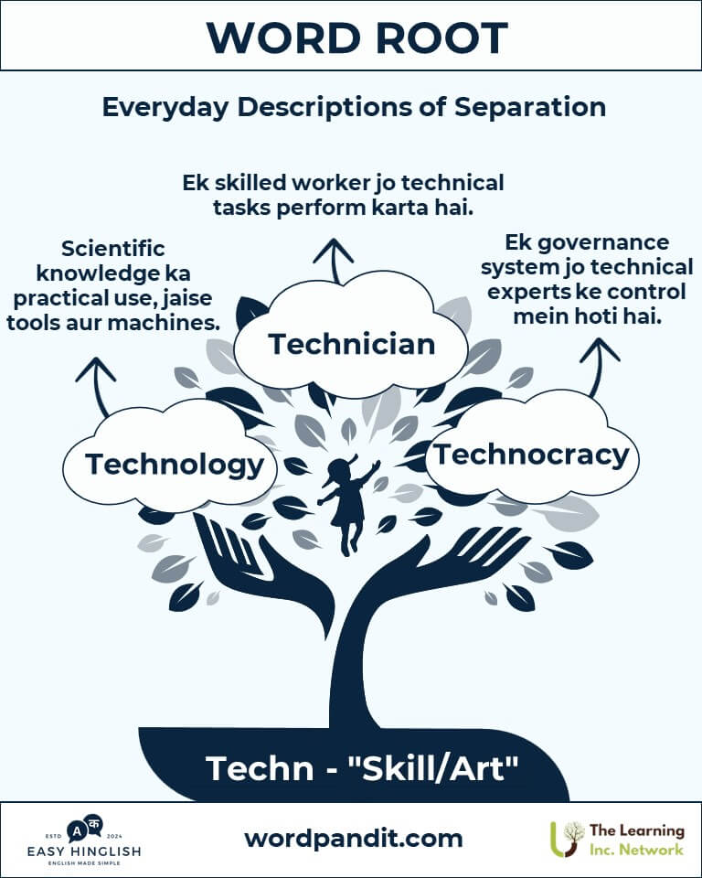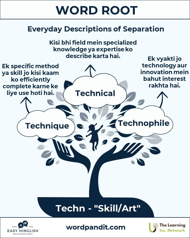 Byline: Explore the fascinating world of the root "techn," derived from the Greek word téchnē, jiska matlab hai "skill" (कौशल) ya "art" (कला)। Yeh root modern civilization ke liye bohot zaruri ban gaya hai, jisme creativity aur expertise (विशेषज्ञता) kaafi important hain।