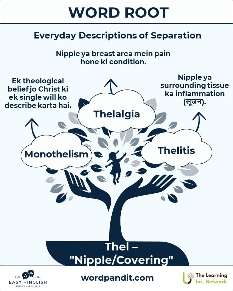 The root "Thel" means "nipple" (स्तनाग्र) or "teat" (थन). It originates from Greek and forms the basis of biological and theological terms.