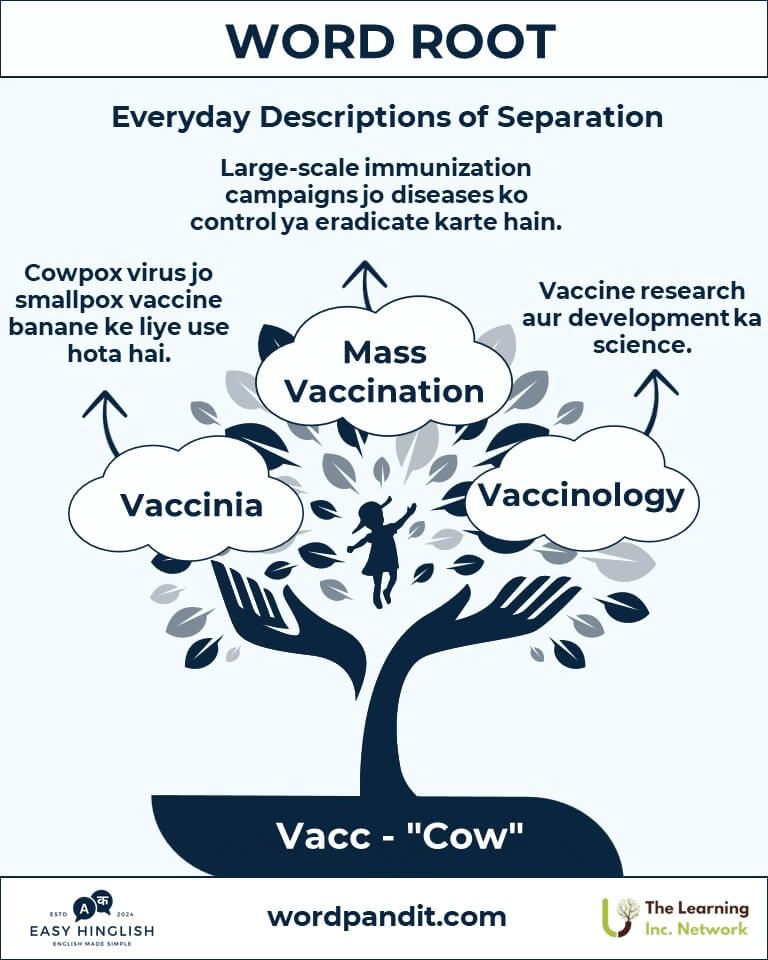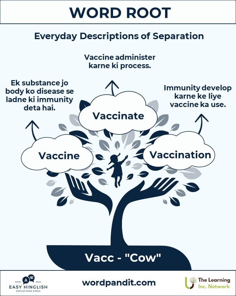 "Vacc" root Latin word "vacca" (cow) से derived है। यह root modern medicine और preventive healthcare के foundation में एक pivotal role play करता है। Words जैसे "vaccine" और "vaccinate" ने language और health systems दोनों में अपनी जगह बनाई है।