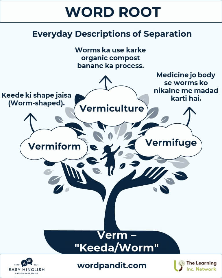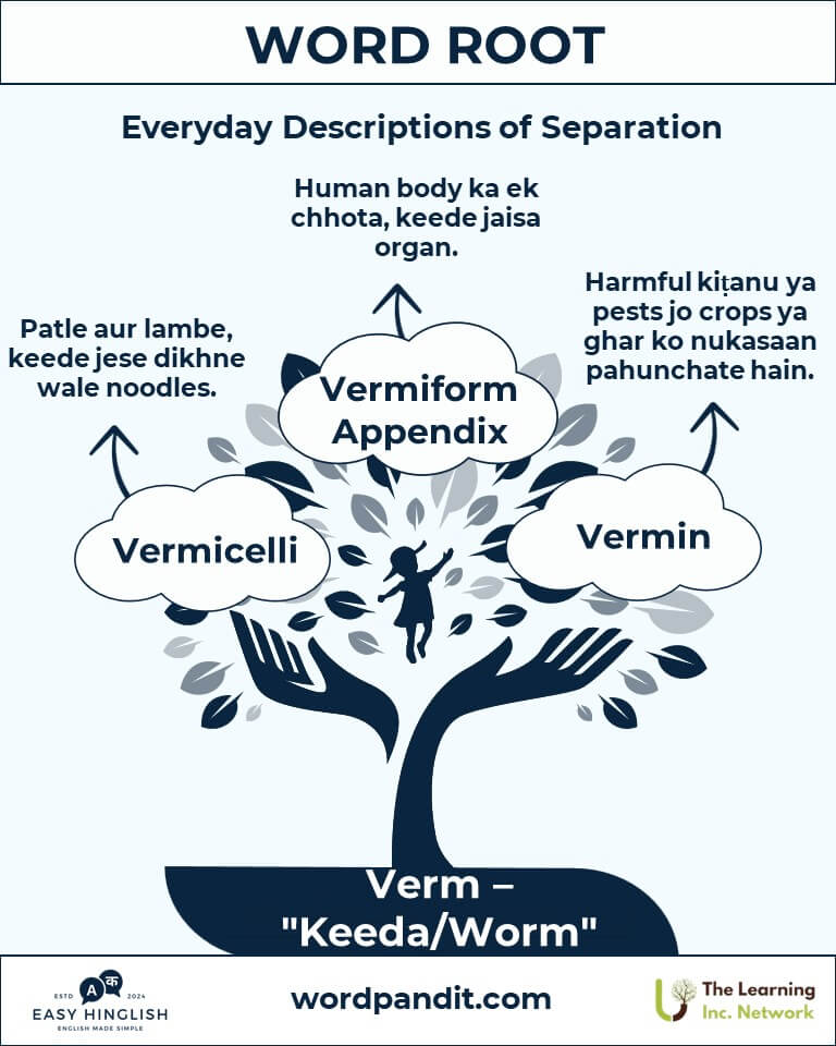 "Verm" root Latin word "vermis" से derived है, जिसका मतलब है "worm" (कीड़ा)। यह root scientific terms जैसे "vermiform" और culinary favorites जैसे "vermicelli" में prominent है। यह motion, texture, और shapes को vividly represent करता है।